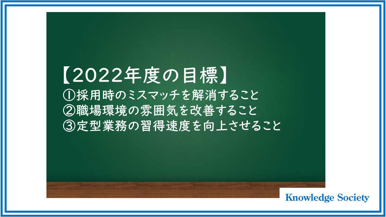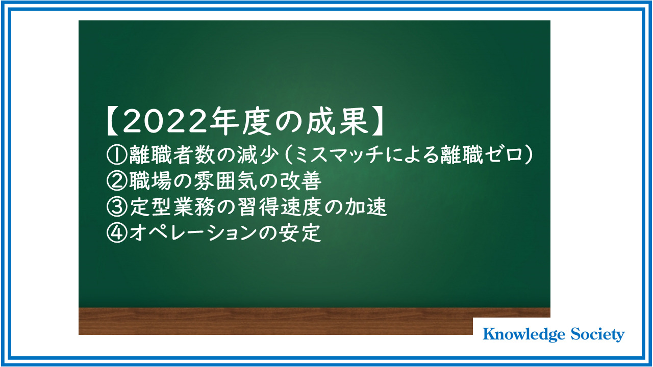 目標として掲げた①採用時のミスマッチを解消すること、②職場環境の雰囲気を改善すること、③定型業務の習得速度を向上させることのいずれにもつながると考えて実施しました。