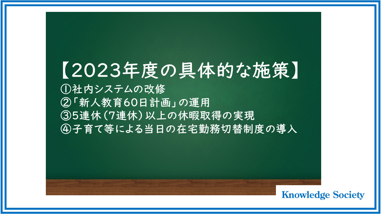 そのため、2023年度は「全スタッフが年末年始休暇を除いて1回以上、5連休(最大7連休)の大型連休を取得できるようにする」という明確に目標を掲げ、年度当初にスタッフ間で調整を図りながら、全スタッフが5連休(最大7連休)を取得できるに計画的に進めていきたいと思います。なお、マネージャー層以上が連休を取得するためには、抱える業務の定型化、現場スタッフへの引き継ぎを進める必要もありますので、ここにも力を入れてかなければなりません。