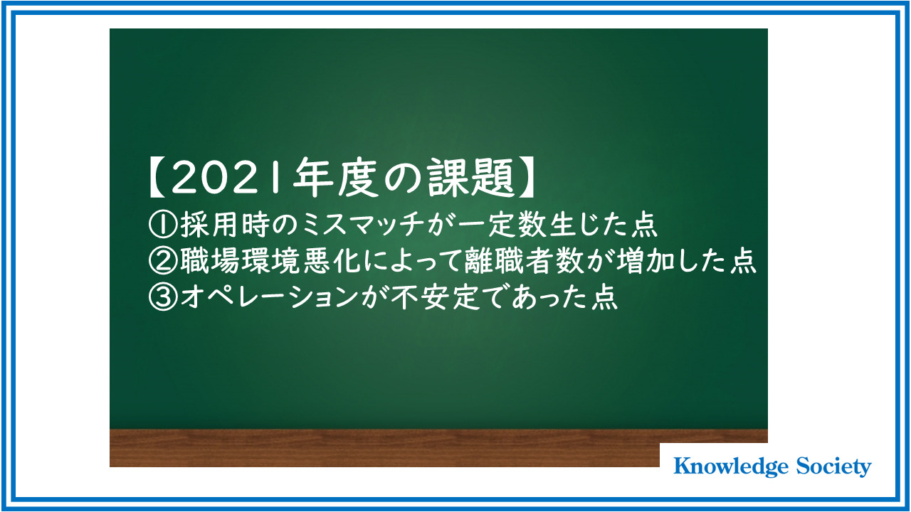 また、2021年度は、定期的に離職者が出て常に新人スタッフへの現場の業務の教育が必要な状態であったため、日々の定型業務を回すことに手一杯な面は否めず、オペレーションの安定しない状況が続いていました。