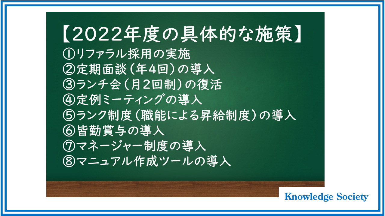 2022年度は採用・人事・労務上の目標として、①採用時のミスマッチを解消すること、②職場環境の雰囲気を改善すること、③定型業務の習得速度を向上させることを掲げ、大きく8つの具体的な施策を実施しました。ここでは、2022年度の成果をまとめます。