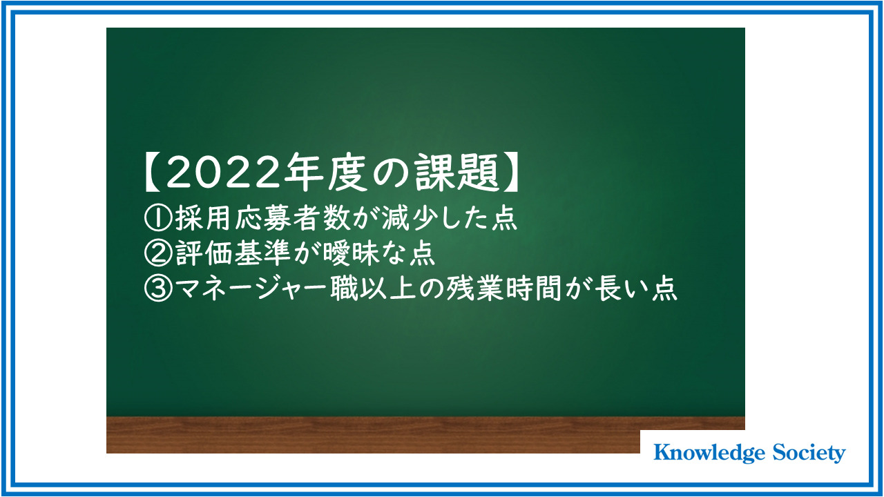 「採用応募者数の減少した点」、「マネージャー職以上の残業時間が長い点」を2022年度の課題として挙げました。解決にあたっては、まず当社で働くスタッフが「働きやすい職場」と感じることを徹底的にヒアリングし、可能な限りの施策を実施していきたいと思います。当社の既存スタッフが働きやすい環境を徹底的に追求していくことで、既に活躍する既存のスタッフと同じようなマインド、同じような環境の方からの応募が増えるのではないかと考えており、リファラル採用と同様の効果があると考えます。