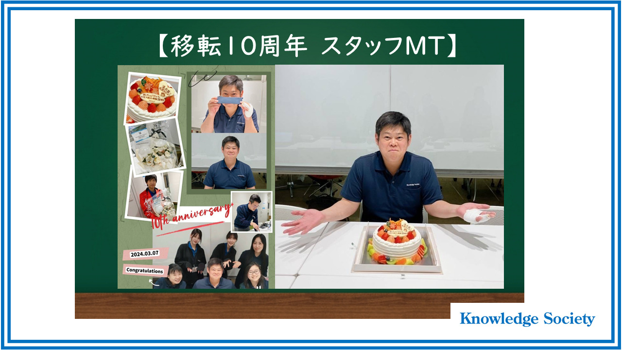 2024年3月2日で、ナレッジソサエティはりそな九段ビルに移転して10年を経過しました。九段ビル移転前に社長に就任した久田の苦労を労おうというスタッフの声から、ささやかながら社内で移転10周年のパーティーを行いました。