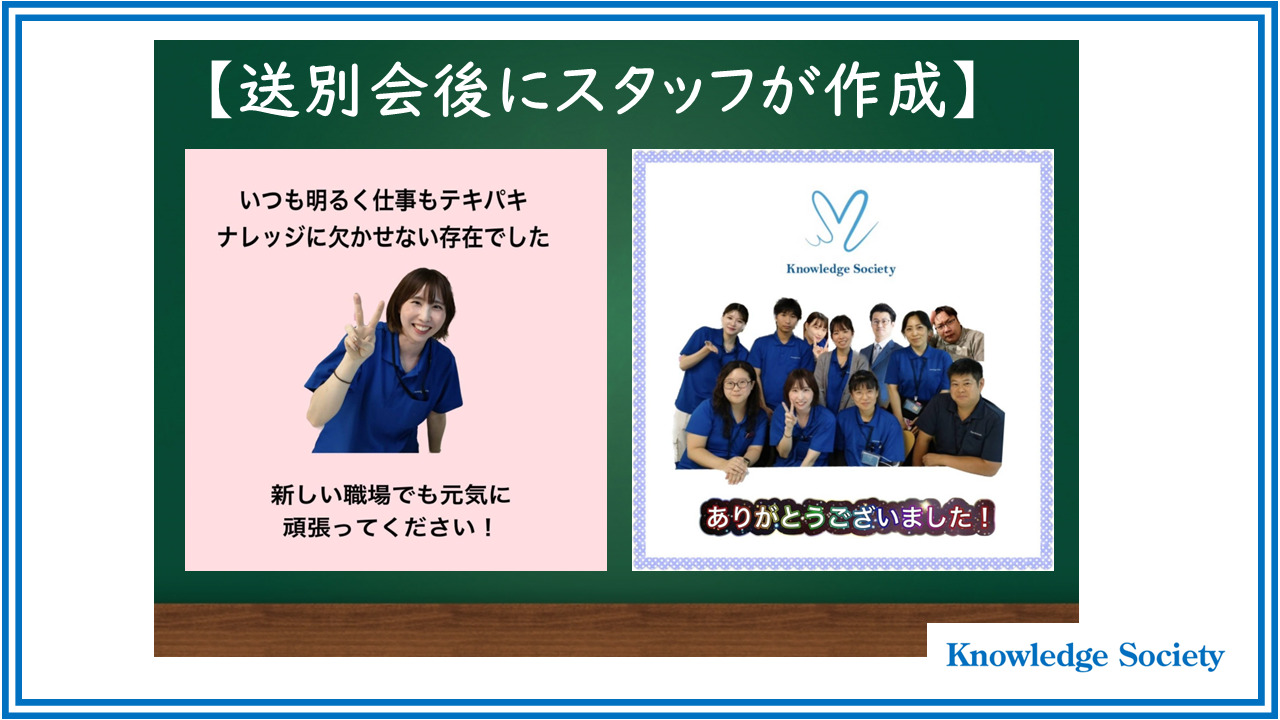 入社時からいつも明るく仕事もテキパキとこなしてくれており、ナレッジソサエティに欠かせない存在でした。退職の意向を聞いたときは心臓が止まりそうでしたが、将来への前向きな選択であり、また退職を決める前も後も変わらず、誠実に、そして周囲への気遣いを欠かさずにテキパキと仕事をこなしてくれました。採用面接を担当した者としては迷いなく採用を決めて良かったと思うとともに、これから別の職場に行ったとしてもお互いを高め合える存在でありたいと思います。正直、当社では色々な形で退職していく人がいますが、当社に貢献してくれた方が前向きに退職されるときは、心の底から感謝と応援したい気持ちが湧いてくるものです。