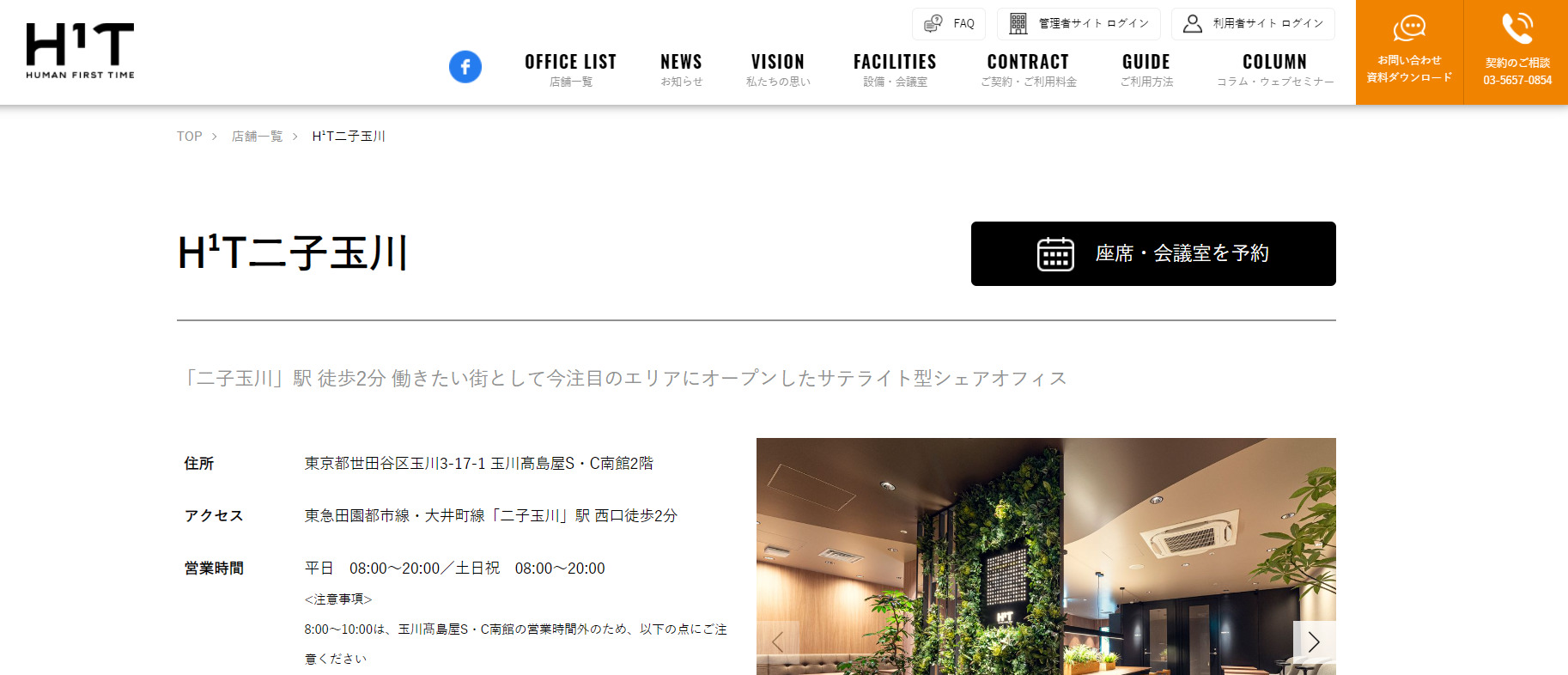 H¹T(エイチワンティー)は、野村不動産が展開するサテライト型シェアオフィスです。 働く人の時間の大切さを考え、利便性が良く、快適な第二のオフィスといえる場を提供します。オフィスに縛られない多様なワークスタイルを実現するために、多拠点化を目指し、展開してまいります。(公式HPより) 二子玉川駅から徒歩2分と好立地ですので通いやすいです。 |