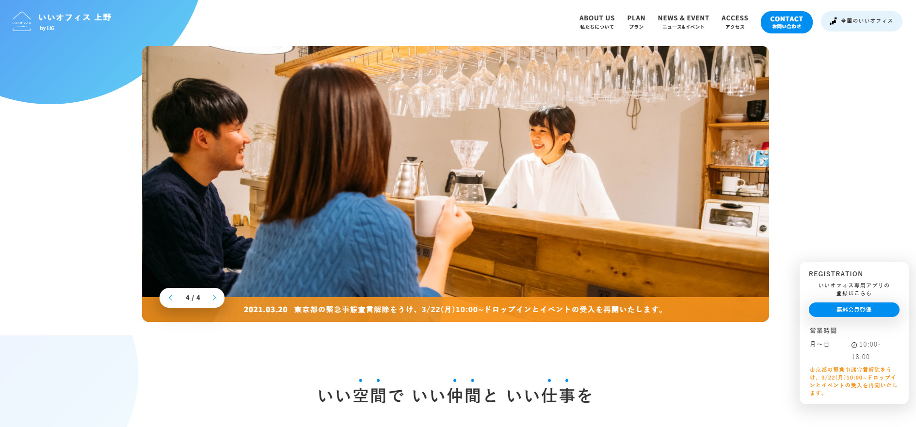 24時間使用できる「いいオフィス byLIG」は、フリーランスの方から企業にお勤めの方まで、自由な働き方を目指す方を応援すべく集中やすい環境を提供します。 キッチンでご飯を作ったりお酒を飲んだり、会員様同士のコミュニティも活発な楽しく働けるオフィスです。月額利用者は10:00~18:00のあいだ、サービスを利用可能です。(公式HPより) まずは数時間利用してから気に入ったら月額会員になることもできます。 |