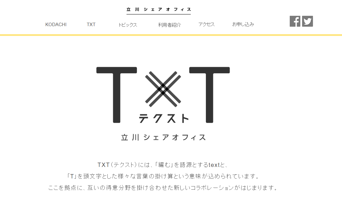 株式会社タウンキッチンが運営するシェアオフィスです。 「TXT(テクスト)」には、「編む」を語源とするtextと、「T」を頭文字とした様々な言葉の掛け算という意味が込められています。 ここを拠点に、お互いの得意分野を掛け合わせた新しいコラボレーションが始まります。新宿から電車で25分に位置する立川駅は、商業施設やオフィスが集積するだけでなく、国の機関が多数存在する多摩地域の中核都市です。 「TXT(テクスト)」には、立川・多摩を中心とした行政、金融機関、地元企業などとの様々なネットワークがあります。 また、「TXT(テクスト)」は、オフィスブース、センターテーブル、ミーティングスペース、テラスの4つの空間で構成されています。 気分転換ができる屋外テラスや、木素材の大きなセンターテーブルがあり、フリーランスや企業が様々なシチュエーションでご利用いただけます。 利用者同士の交流会や、補助金などの情報提供や各種セミナーの開催など、事業成長に役立つ場と情報をご提供します。 さらに、地元のまちづくり会社をはじめ、金融機関、商店会、周辺施設など、「まち」とのコラボレーションを通じた事業展開のチャンスが広がっています。(公式HPより) 料金が比較的リーズナブルで、利用し続けやすいです。 |