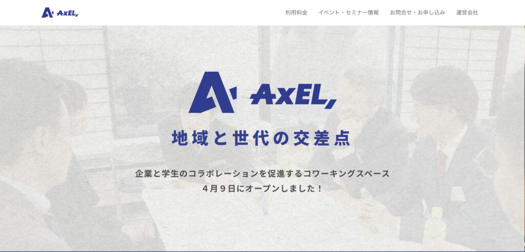 「AxEL,」は、旧市民球場前にあるシェアオフィスです。 「学生×社会人」や「田舎×都市部」など、さまざまな地域と世代の交差点として交流が行われるシェアオフィスとして2022年4月にオープンいたしました。 |
