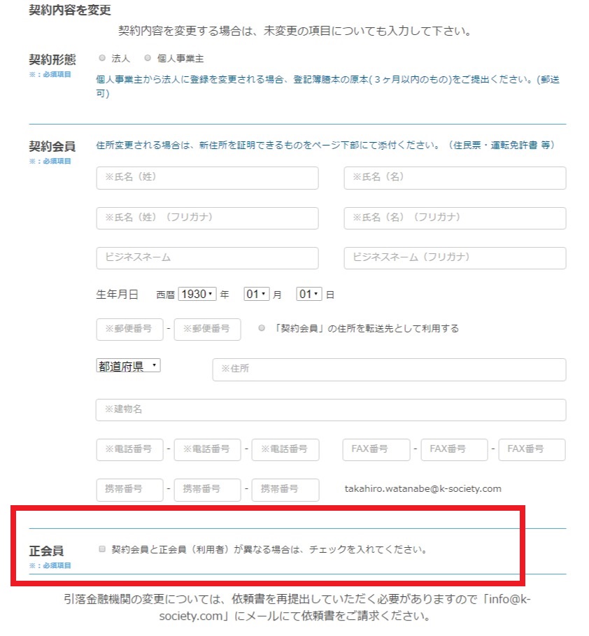 シェアオフィス・バーチャルオフィス@東京都千代田区|ナレッジソサエティ > スタッフブログ > 【Q&A】正会員(ユーザー)の変更方法がわからない > 契約内容を変更画面