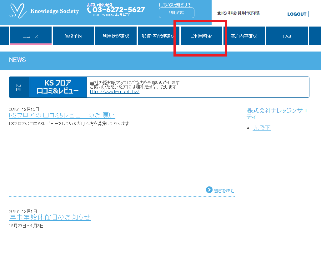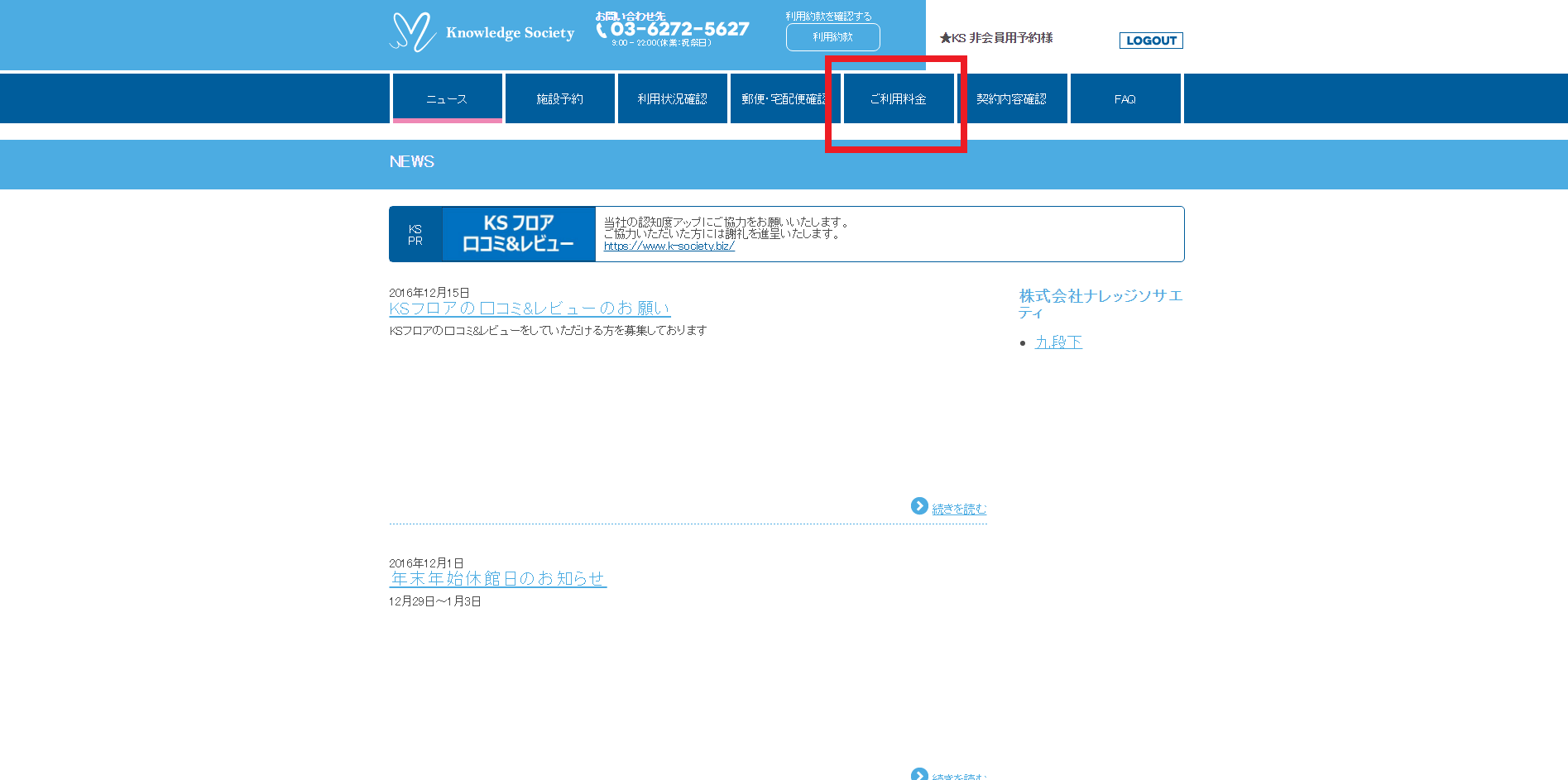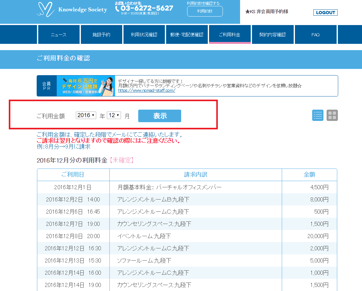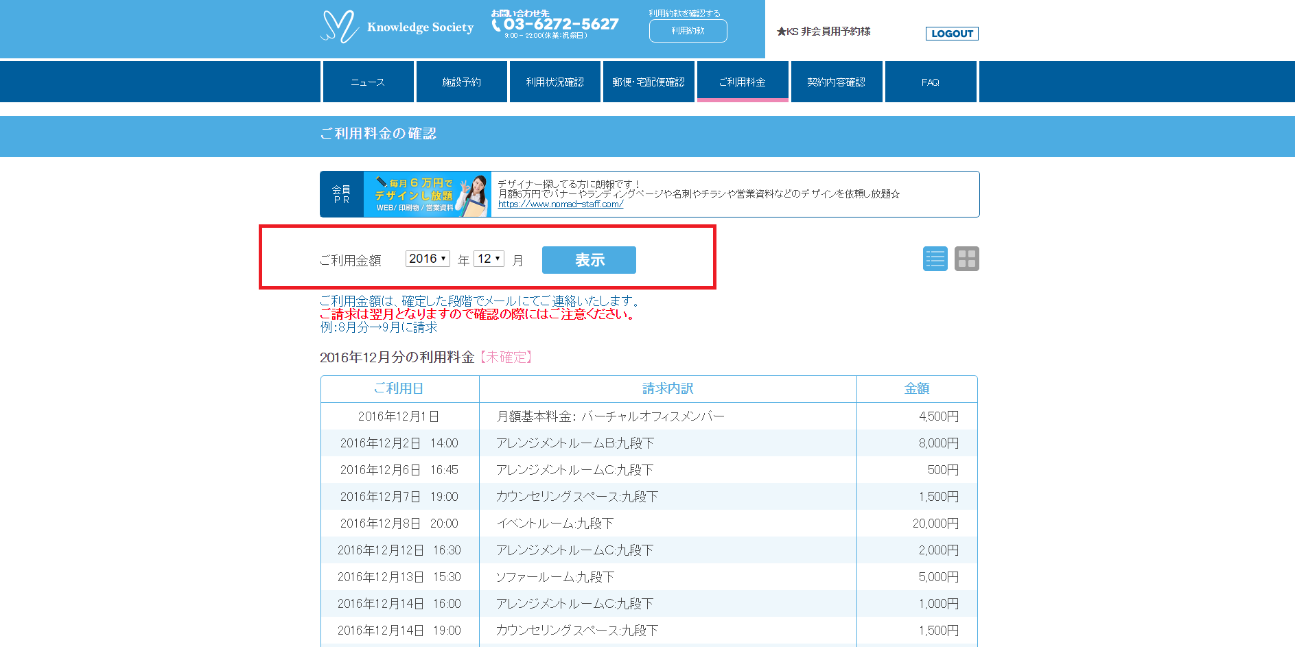 ナレッジソサエティのシェアオフィス、バーチャルオフィスの毎月の利用料金は会員専用オンラインサイトで確認可能です。