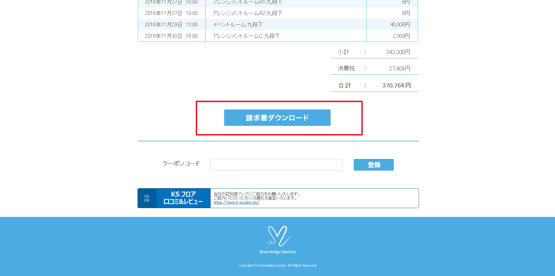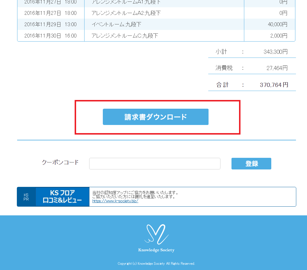 下部の赤枠「請求書ダウンロード」ボタンよりPDF形式でダウンロード可能です。