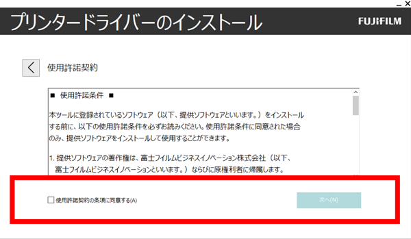 「FUJIFILM Apeos C2570」が選択されていることを確認の上、インストール