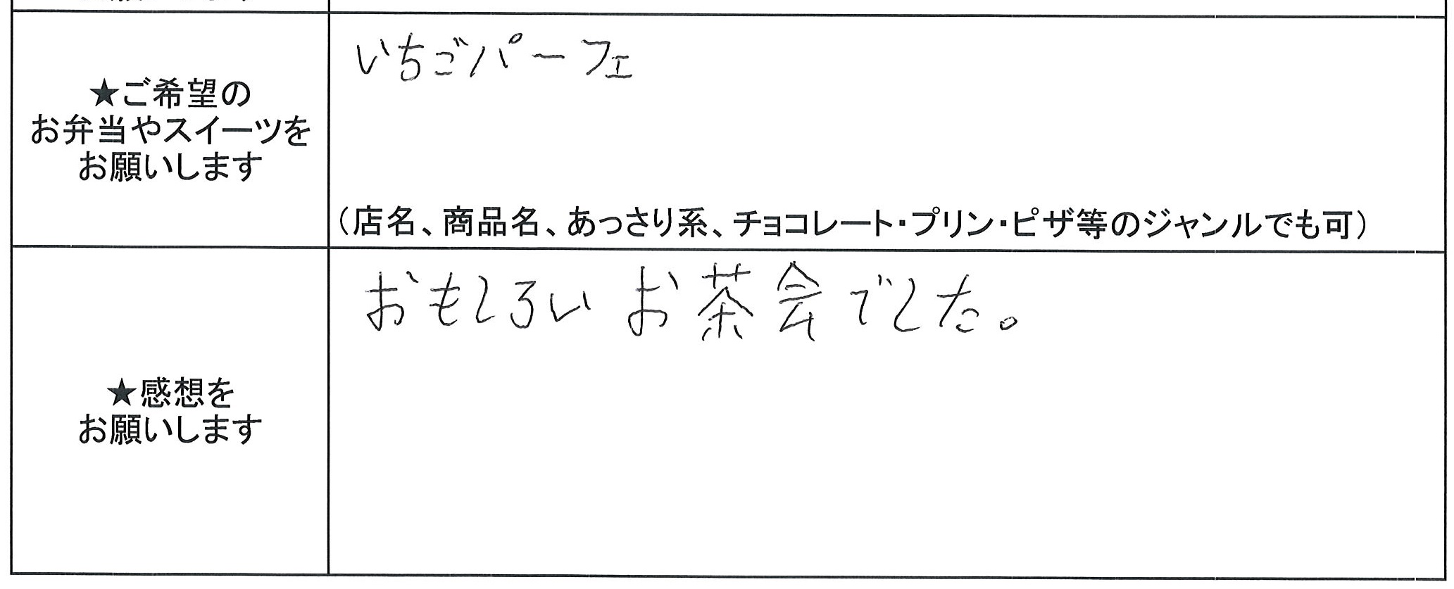 初参加ありがとうございました。スイーツのご要望ありがとうございます。