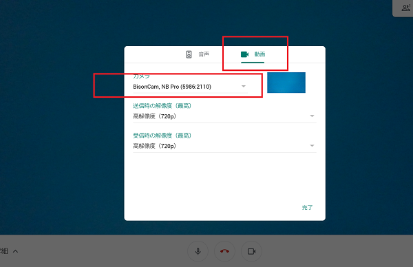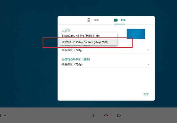 右下の3つの点マークより「設定」を選択します。次に「動画」タブを選択し、カメラの選択画面にて「USB 3.0 HD Video Capture」を選択します。すると、カメラの映像に切り替わります。