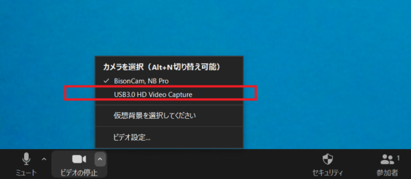 左下のビデオのマークの選択画面より「USB 3.0 HD Video Capture」を選択します。すると、カメラの映像に切り替わります。