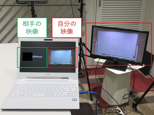 手前のパソコン画面左側のiPhoneの表示は相手の映像です。