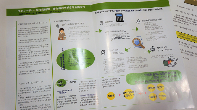 また、私が行政書士という仕事をしているので、お客様からのご要望に応じて、法務に関する業務については、行政書士事務所で対応できるという点があります。例えば、権利処理の手続きを進めていくなかで、場合によっては綿密な契約書を求められることがあります。そのような時、契約書の作成については行政書士事務所の方にご依頼を頂き、手続きを進めていきます。著作権の手続きを進めていくにあたり、どうしても権利処理先がわからない場合は、文化庁に対して裁定を申請して利用するという方法があります。この裁定申請の利用についても、行政書士が代理して行うことができますので、ご要望があった場合には行政書士事務所の方にご依頼頂き、対応しております。