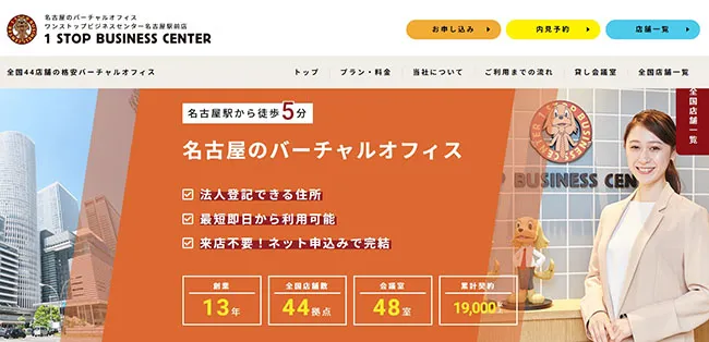 格安バーチャルオフィス 「ワンストップビジネスセンター」では、法人住所登記を基本としたエコノミーなタイプからワンストップでビジネスをサポートするエグゼクティブプランまでさまざまなプランをご用意しております。 名古屋市西区の住所を事務所として、法人登記、ホームページや名刺の表記にご利用いただけるほか、お受け取りさせていただいた郵便物を保管して、お客様ご指定の住所に転送いたします。名古屋をお客様のビジネスの拠点としてご活用ください。(公式HPより) ビジネスとして信用力のある住所を利用しつつ、会議室スペースも必要なときだけ利用できるのが魅力です。 |