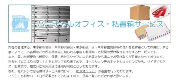 「モバレン渋谷」の管理する、東京都渋谷区・東京都新宿区・東京都品川区・東京都豊島区などの住所を私書箱としてお貸し出しすることによって、お客様のご住所を相手先に知られることなく郵便物・宅配便の受け取りを代行します。 また、届いた郵便物は「転送」「保管」「自社スタッフによるお届け」の中から好きな方法を選んで受け取りが可能です。 料金も「どこよりも安く!」を心がけておりますので、オークションのネットショッピングから、サイドビジネス、起業まで、幅広い用途に活用できます。(公式HPより) 渋谷区・新宿区・品川区・豊島区などの中から好きな住所を選んで利用します。 |