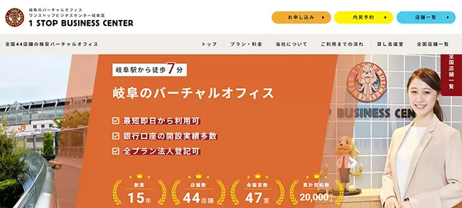 ワンストップビジネスセンター岐阜店は、法人登記で利用可能な住所を提供しています。月額料金を抑えられるエコノミープランから、電話転送・FAX転送に電話秘書代行までをサポートするプレミアムプランまで3つの主要プランをご用意しています。どのプランも週1回の郵便転送がついています。 (公式HPより) |