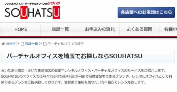 格安のバーチャルオフィスや格安の私設私書箱・セカンドアドレスを都心でお探しなら、「SOUHATSU(ソウハツ)」をぜひご利用ください。 住所利用や郵便物の受け取り・転送はもちろんのこと、法人登記にも対応しております。あなたのビジネスを確実にサポートしてまいります。さらに、電話番号やFAX番号も格安でご提供しております。 貴社のビジネスのご予算・ご要望に合ったプランをお選びください。(公式HPより) |