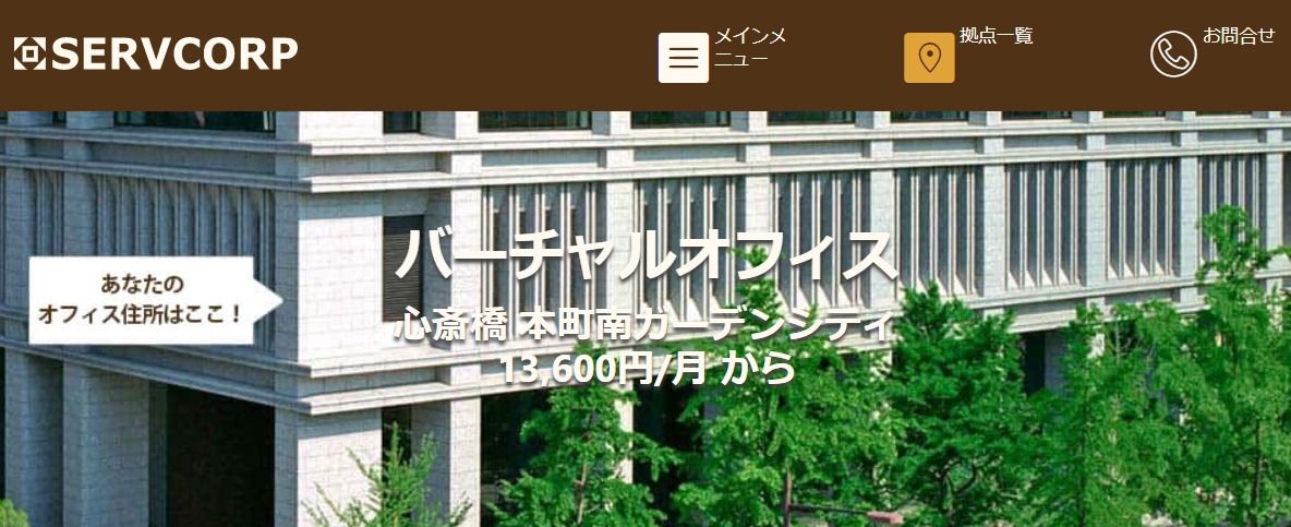 | 説明 | SERVCORPのバーチャルオフィスを利用されると、一等地のビジネス住所と設備を活用しつつ、ワークスペース、人件費、テクノロジーなどの運用コストを削減できます。(公式HPより) |