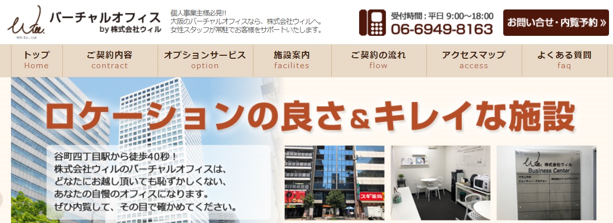| 説明 | 地下鉄谷町4丁目駅より徒歩3分。1-A出口なら30秒。 大阪法務局の近くで法人登記にも大変便利。 大阪城、大阪府庁、商工会議所等が徒歩圏内です。近隣に銀行、郵便局は複数あります。 歴史と文化、行政の融合した活気ある街並みでビジネスを始めませんか? (公式HPより) |