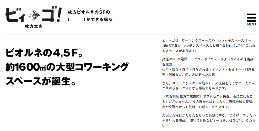 シェアオフィス・バーチャルオフィス@東京都千代田区|ナレッジソサエティ > バーチャルオフィス > バーチャルオフィスまとめ > 大阪のバーチャルオフィス一覧【2024年版】 > バーチャルオフィス ビィーゴ 枚方本店