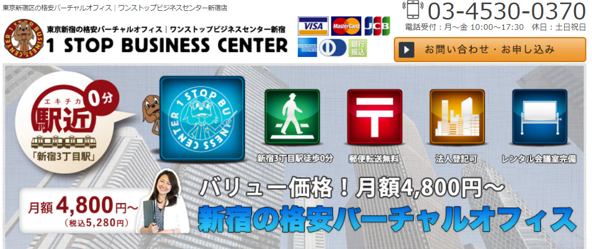 格安バーチャルオフィス 「ワンストップビジネスセンター」では、法人住所登記を基本としたエコノミープランから、ワンストップでビジネスをサポートするエグゼクティブプランまで、お客様に合った様々なプランをお選びいただけます。 サービス内容には、会員様の業務サポートとなる電話代行サービス(秘書電話対応サービス)、会社登記代行サービス、ホームページ作製サービス、名刺・会社ロゴデザインサービスなど人件費削減にもつながる便利なサービスをご用意しております。(公式HPより) |